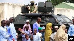 Dubban 'yan gudun hijira ne a wani sansani dake Maiduguri suka tarbi shugaba Goodluck Jonathan na Najeriya da kuwwar "Sai Buhari" a lokacin da ya kai wata ziyara ta ba-zata a babban birnin na Jihar Borno.