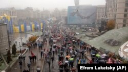 Dubban masu zanga zanga na gudanar da tattaki a Kyiv babban birnin kasar Ukraine, don nuna rashin amincewarsu da shirin Shugaba Volodymyr Zelenskiy na shirya zabe a yankin gabashin Ukraine da yake karkashin ikon ‘yan aware masu samun goyon bayan Rasha.