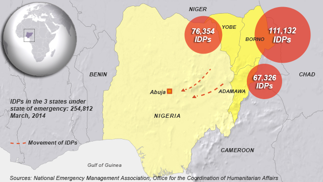 Taswirar yawan masu gudun hijira na cikin gida a jihohin da ake dokar-ta-baci, ya zuwa watan Maris na 2014. (VOA Graphics)